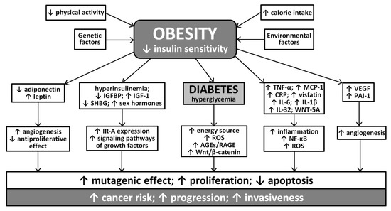 Epidemiological evidence is linking obesity with at least 13 cancer sites, which was documented in two large meta-analyses [20,46]. The pathomechanisms linking obesity and diabetes with cancer risk include obesity-associated dysfunction of adipose tissue, which play an important endocrine and metabolic role [46]. Its excess, due to its hyperplasia and hypertrophy, leads to impaired secretion and action of hormones and cytokines produced by adipose tissue. The production of resistin, leptin, PAI-1 (plasminogen activator inhibitor-1) and VEGF (vascular endothelial growth factor) as well as inflammatory cytokines: TNF-α (tumor necrosis factor-α), IL-6 (interleukin-6), IL-1β (interleukin 1β), MCP-1 (monocyte chemoattractive protein-1) and CRP (C-reactive protein) increases, while production of adiponectin, which improves insulin sensitivity, inhibits angiogenesis, protects against inflammation and which is also (in vitro) an inhibitor of cell growth and proliferation of certain cancers, decreases. Inflammatory cytokines also activate the NF-κB (nuclear factor kappa B) transcription factor that plays an important pro-proliferative role [45]. In recent years, a number of newer adipokines involved in inflammatory process in adipose tissue were also identified: calprotectin, CHI3L1/YKL40 (chitinase-3-like protein 1), IL-32 (interleukin-32), osteopontin, chemerin, tenascin C, visfatin and WNT-5A (wingless-type MMTV integration site family 5A). All these adipokines play an important role in insulin-resistance, type 2 diabetes and also cancer development [46]. Moreover, a part of adiponectin, also a downregulation of other anti-inflammatory adipokines: fibroblast growth factor 21 (FGF21), secreted frizzled-related protein 5 (SFRP5) and lipocalin 2 (LCN-2) is observed [47].