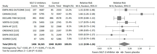 Based on the data from published cardiovascular and renal outcome trials [111,112,113,114,115,116,117,119,120,125], I performed a meta-analysis of the risk of neoplasms incidence in those trials. I requested the data regarding incidence of malignancies in the Empagliflozin Outcome Trial in Patients with Chronic Heart Failure and a Reduced Ejection Fraction (EMPEROR Reduced), but I did not receive these data and it was not included into meta-analysis. Statistical analysis was performed using PQStat v.1.8.0 software (PQStat Software, Poznań, Poland). A random effects model (Mantel-Haenszel method) was used to calculate pooled Risk Ratios (RR). Overall risk of neoplasm incidence appeared to be insignificant, HM-RR 1.11 (95% confidence interval 0.98–1.26), p = 0.102. The RRs for each study and their summary are presented as the forest plot (Figure 3).