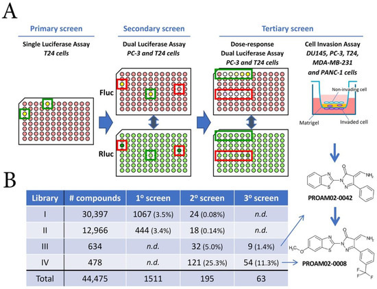 Overview of the screening strategy for the identification of candidate low molecular weight (LMW) compounds (A) Three screening rounds were performed with four compound libraries. Initially, libraries I and II were tested in E-cadherin-negative human bladder cancer T24 cells that express the Ecad-Fluc/Rluc reporter construct. In the secondary screen, a dual luciferase assay was performed in PC-3 (E-cadherin intermediate-positive) and T24 (E-cadherin-negative) cells that express the Ecad-Fluc/Rluc reporter construct. Compounds identified in the primary screening round and compounds from libraries III and IV were used. During the third round of screening, dose-response dual luciferase assays were performed in both reporter models. In addition, invasion assays were performed in multiple human cancer cell lines, including DU145, PC-3, T24, MDA-MB-231 and Panc-1 cells. Firefly luciferase-positive wells are indicated in yellow, and Renilla luciferase-positive wells are depicted in green. Excluded wells are depicted in red boxes due to aberrant Renilla luciferase values. (B) Overview of the number of compounds tested and identified in the three screening rounds. N.D. = not determined.
