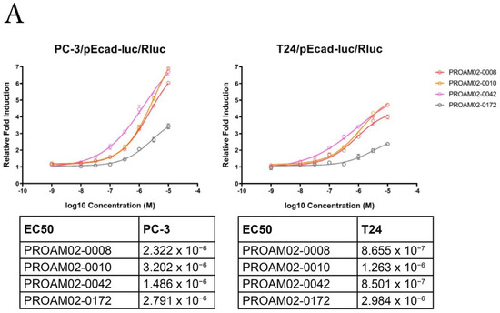 Two-thousand five hundred T24/pEcad-luc/Rluc (clone 1.c.4) or PC-3/pEcad-luc/Rluc (clone 2.b.4) cells were seeded in a 96-well culture plate. Three days later, growth medium was replaced by LMW compound-containing growth medium in a final concentration ranging from 1.0 nM to 10 µM or vehicle (≤0.1% DMSO)-containing medium. After 16 h of treatment, the medium was removed, and the cells were rinsed once with PBS. Single and dual luciferase reporter assays were performed, according to the manufacturer’s instructions (Promega), and luciferase activity was measured on a Victor3 Multilabel Counter (PerkinElmer, Waltham, MA, USA). In dual luciferase assays, Firefly luciferase activity was normalized to Renilla luciferase activity. The fold induction in luciferase activity was calculated relative to vehicle (DMSO)-treated cells. Data were analyzed with GraphPad Prism 8 software to determine EC50 values of the compounds using a nonlinear fit sigmoidal dose-response curve.