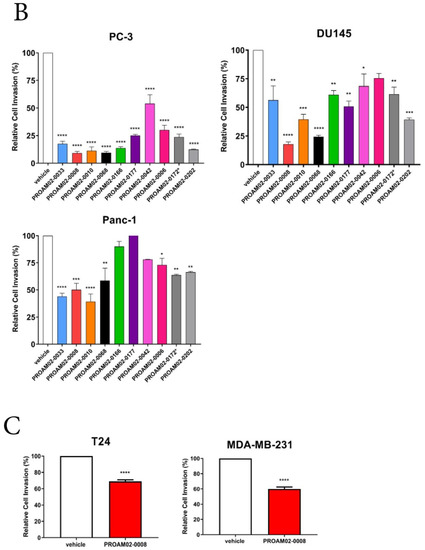 PROAM02-0008 was identified as a promising candidate agent, showing an even stronger inhibition of PC-3 cell invasion up to 90% at 10 µM compared to the initial lead compound PROAM02-0042 in PC-3 cells (Figure 2B). Similar to the results in PC-3, DU145 and Panc-1 cell lines, treatment with 10-µM PROAM02-0008 resulted in a significant inhibitory effect on invasion in the MDA-MB-231 and T24 cells (p < 0.0001) (Figure 2C). Based on the ability to induce E-cadherin (re)expression and inhibit migration and invasion in various cancer cell lines, the PROAM02 class of chemical compounds and—more specifically—PROAM02-0008 were identified as candidate drugs.