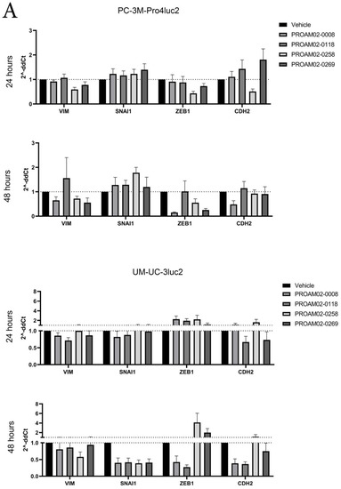 The acquisition of invasive behavior has been linked to the reduced expression of mesenchymal genes and EMT transcription factors. Treatment with LMW compounds reduced the mRNA expression of mesenchymal markers vimentin and N-cadherin (CDH2) in PC-3M-Pro4luc2 and UM-UC-3luc2 cells after 24 and 48 h. Moreover, the expression of ZEB1 and SNAI1 were reduced upon treatment with the LMW compound (Figure 3A).