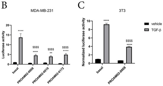 TGF-β represents a key cytokine involved in invasiveness via the induction of ZEB1 and SNAI1 EMT transcription factors [13,14]. For this, we evaluated the effect of selected LMW compounds on SMAD2/3-mediated TGF-β signaling activity in the stable reporter cell line MDA-MB-231/CAGAluc2 [14]. The addition of TGF-β1 resulted in a significant induction of reporter activity compared to vehicle-treated cells (**** p < 0.0001) (Figure 3B). In the presence of TGF-β1, PROAM02-0008, -0010 and -0172 significantly antagonized TGF-β-mediated reporter activity ($$$$ p < 0.001). The inhibitory effects of PROAM02-0008 on TGF-β signaling was also confirmed in another reporter assay using NIH-3T3 cells that were transfected with the CAGA12 luciferase reporter [15] (Figure 3C).
