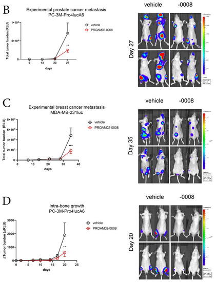 Based on our in vitro and in vivo data, PROAM02-0008 was selected and evaluated in validated preclinical disease models of experimental metastasis formation and intraosseous growth in vivo [12,13]. Treatment with PROAM02-0008 resulted in a significant reduction of total tumor burden in experimentally induced bone metastasis models using real-time whole-body optical imaging of firefly luciferase-expressing human prostate and bladder cancer cells (Figure 4B,C) (p = 0.0073 and p = 0.0002). Moreover, treatment with compound PROAM02-0008 significantly reduced the intraosseous growth of human prostate cancer cells (p = 0.0049) (Figure 4D). Overall, these results indicate that LMW compounds can inhibit tumor aggressiveness and metastatic behavior in human prostate and breast cancers in vivo.