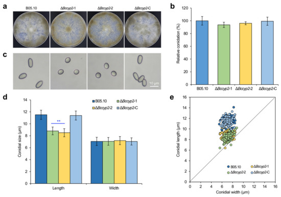 To investigate whether BcCYP2 plays a role in asexual reproduction and conidial morphogenesis, we inoculated conidial suspensions of the test strains on CM plates, and then determined their sporulation ability and conidial morphology at 10 days post-incubation/inoculation (dpi). Our data indicated that all the tested strains displayed similar conidiation abilities (Figure 1a,b). The morphological analysis of conidia produced by the tested strains showed that the conidial length of the ∆Bccyp2 mutant (8.81 ± 1.08 μm) was significantly shorter than that of the WT and complemented conidia (11.5 ± 1.11 μm and 11.39 ± 1.18 μm, respectively). However, the conidial width of all tested strains (7.05 ± 1.35 μm, 7.06 ± 1.42 μm, and 7.05 ± 1.36 μm for the WT, ∆Bccyp2 and complemented strains, respectively) was similar. The length/width ratio of the mutant conidia was 1.22 (1.63, 1.61 for the WT and complemented conidia, respectively), which made the ∆Bccyp2 mutant conidia smaller, more globose and less elliptical than controls (Figure 1c–e). These data demonstrate that BcCYP2 is dispensable for B. cinerea conidiation and mycelial growth but plays an important role in conidial morphogenesis.