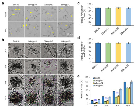 The initial formation of ICs was observed at ~16 hpi in the WT and complemented strains; however, for ΔBccyp2 mutants, the ICs were firstly observed until 20 hpi (Figure 3b). In addition, the ICs produced by the mutants were significantly smaller in size than those of the WT and complemented strains at 24, 36 or 48 hpi (Figure 3b,e). The results indicate that BcCYP2 mediates the development of ICs in B. cinerea.