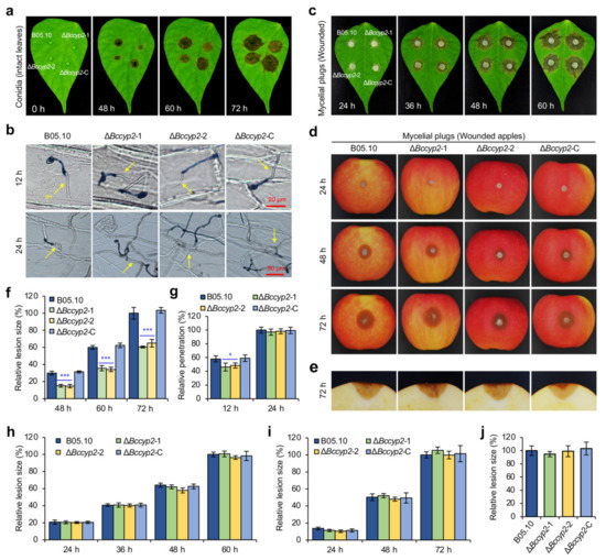 Conidia were harvested from 10-day old cultures on PDA at 20 °C. Conidial droplets (2 × 105 conidia/mL in ½ liquid CM, 5 µL) of the WT, ΔBccyp2 and ΔBccyp2-C strains were inoculated on green bean leaves [32,33,35,36]. For pathogenicity assays using mycelia, mycelial plugs (5 mm in diameter) from 3-day old culture of the tested strains were inoculated on surfaces of the related plant materials, including green bean leaves and apple fruits. All the inoculated materials were incubated in plastic containers with a sheet of plastic film sealed on the top of each container to maintain a high humidity of infection conditions. B. cinerea inoculated leaves (at 0, 48, 60, and 72 hpi for inoculation with conidial suspension; at 24, 48, and 72 hpi for inoculation with mycelial plugs), apple fruits (at 24, 48 and 72 hpi for inoculation with mycelial plugs) were photographically documented at the indicated time points post-inoculation in the parentheses. Quantification of lesion size was analyzed using ImageJ software (https://imagej.nih.gov/ij/download.html (accessed on 1 January 2021)).