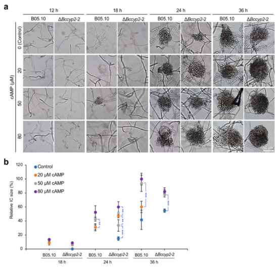 Cyclic adenosine monophosphate (cAMP) restores IC formation of the BcCYP2 deletion mutants. (a) Exogenous cAMP rescues defects of IC formation of the ΔBccyp2 mutants. Conidial droplets (10 µL) supplemented with cAMP (0, 20, 50, 80 µM) were inoculated on glass slides and incubated in the dark for 12, 18, 24 or 36 h; the development of ICs was then photographically documented. (b) Quantitative analysis of the sizes of ICs produced by the tested strains. IC: Infection cushion. **, ***: significance at p < 0.01 and 0.001, respectively.