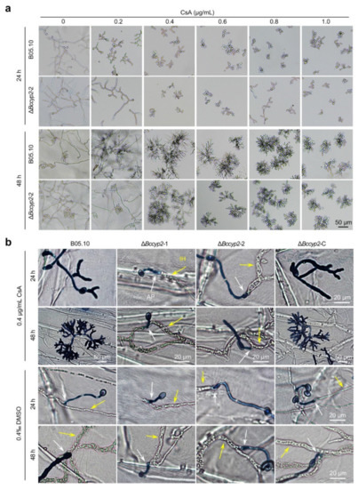To determine whether BcCyp2 is a target of CsA, an immunosuppressive agent that binds to the cyclophilin and then inhibits calcineurin [11,17], we tested the sensitivity of the mutant strain ΔBccyp2 to CsA. Our results demonstrated that conidial germination and hyphal development of the WT strain were dramatically suppressed. Importantly, hyphal branching of the WT strain was also severely altered (Figure 6a; Figure S7). Compared to the WT strain, conidial germination and hyphal development of the ΔBccyp2 strain displayed less inhibition by low concentration of CsA (0.2~0.4 μg/mL). The suppression of conidial germination showed a CsA concentration-dependent fashion, and the inhibition phenotype of the mutant tended to be the same as the WT strain when higher doses of CsA were used (Figure 6a; Figure S7). The results suggest that BcCyp2, as a functional cyclophilin protein, is one of the targets of CsA.