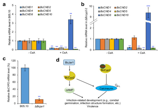 BcCyp2 regulates expression of calcineurin-dependent (CND) genes and is regulated by H3K4 demethylase BcJar1. (a,b) Relative transcriptional level of CND genes in the WT B05.10 (a) and mutant ΔBccyp2-2 (b) strains. Conidia of the two strains were grown in liquid YG medium for 60 h and then moved to the same medium without the nitrogen source (YG-N) and incubated for 4 h, the mycelia of the tested strains were further incubated with YG-N medium containing 10 μg/mL CsA for 3 h and then collected for RNA extraction. The mRNA levels of Ca2+/calmodulin signaling genes were determined by quantitative reverse transcription PCR (qRT-PCR). (c) Loss of BcJAR1 [36] downregulates BcCYP2 expression level. Mycelial plugs of B05.10 or ΔBcjar1 strain were induced for IC formation. At 36 hpi (during IC formation), mycelia of the tested strains were then collected and subjected to RNA extraction. The mRNA levels of BcCYP2 were determined by qRT-PCR. (d) Proposed models describing BcCyp2 regulation of fungal infection-related development and virulence as well as CsA-mediated functional blocking. Data represent means ± SD from three independent experiments. **, ***: significance at p < 0.01 and 0.001, respectively.