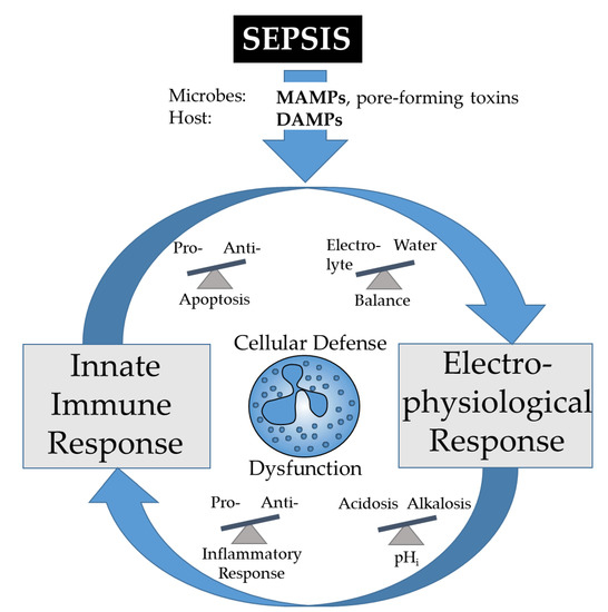 During sepsis, microbe-associated molecular patterns (MAMPs) and damage-associated molecular patterns (DAMPs) may alter various homeostatic balances. The resulting electro-physiological changes including alterations of the intracellular pH (pHi) will affect the inflammatory response of innate immunity and in consequence, vital cell functions. The mounted immune response including the feed-in of MAMPs and DAMPs will further affect cellular electrophysiology, which finally may form a vicious circle resulting in cellular dysfunction and death.