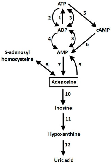 Adenosine, a purine nucleoside, plays several behavioral and physiological roles throughout the central nervous system (CNS). Adenosine is generated in the living brain from adenine nucleotides such as adenosine triphosphate (ATP) and adenosine monophosphate (AMP). A much less important, other source of adenosine is S-adenosylhomocysteine, that originates from S-adenosylmethionine after physiological transmethylation [1]. Increased firing of neurons is associated with increased consumption of ATP, nucleotide dephosphorylation, and increases of intracellular adenosine levels (Figure 1). Since equilibrative nucleoside transporters are present in neuronal membranes, the extracellular levels of adenosine will also increase under such conditions. Thus, extracellular adenosine concentrations fluctuate, depending on neuronal activity.