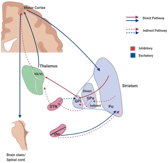 Normal movements require a delicate, coordinated balance of activity in the direct and indirect pathways [65]. The healthy brain contains dopaminergic neurons in the substantia nigra pars compacta that project to the striatum. Dopamine from these neurons stimulates the MSNs from the direct pathway via D1R and inhibits the MSNs from the indirect pathway via D2R. Both actions of dopamine facilitate motor activity. Loss of dopaminergic neurons from the brain, as occurs in Parkinson’s disease, will result in a decreased activity of the direct pathway, an increased activity of the indirect pathway and impaired motor control, particularly hypokinesia.