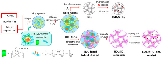 The mesoporous TiO2 and TiO2-SiO2 supported RuO2 catalysts were prepared according to the procedure depicted in Figure 1. First, a hybrid organic–inorganic material was obtained in aqueous phase by self-assembly of sol-gel synthesized TiO2 nanoparticles around the supramolecular assemblies formed between the randomly methylated β-CD (RaMeβCD) and the Pluronic F127. Then, the hybrid mesophase was either subjected to calcination at 500 °C to yield a mesoporous TiO2 material (Figure 1A) or further coated with a silica shell using the tetraethyl orthosilicate (TEOS) as a silica source (Figure 1B). By varying the TEOS concentration in the titania hydrosol, mesoporous titania-silica composites (TiO2-SiO2) with different silica loadings and porosities were obtained after template removal at 500 °C. In both syntheses, the obtained mesoporous supports were subsequently impregnated with an aqueous solution of ruthenium nitrosyl nitrate, followed by a thermal treatment at 400 °C under air flow, affording mesoporous RuO2@TiO2 and RuO2@TiO2-SiO2 heterostructures.
