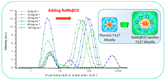 Dynamic light scattering (DLS) plots of the micellar solution of Pluronic F127 (10% w/v) prepared with increasing concentrations of RaMeβCD from 10 mg mL−1 to 110 mg mL−1.