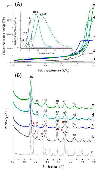 X-ray diffraction (XRD) patterns also confirmed that both the supramolecular template and silica loading had an impact on the crystalline properties of titania-based solids (Figure 3B). Indeed, in the TiO2-sg material, the intense sharp peak at 2θ = 27.4° is characteristic of the (110) plane of the rutile polymorph (R) (JCPDS card no. 00-034-0180), which results from the transformation of metastable anatase (A) (JCPDS card no. 00-021-1272) and brookite (B) (JCPDS card no. 01-076-1934) during calcination. The crystallite sizes of those polymorphs determined from the Scherrer formula were 36 nm (A), 19 nm (B), and 60 nm (R). The rapid growth of rutile crystallites may be attributed to the high level of aggregation of particles in the sol-gel TiO2 material, facilitating the contact between neighboring grains. Indeed, as shown previously by Zhang et al. [52,53], when the anatase particles are in intimate contact with each other, the interfaces of the contacting grains provide the nucleation sites of the rutile phase. Once the nucleation is initiated, rutile particles grow very fast and the phase transformation spreads quickly throughout the whole material. Noticeably, when the RaMeβCD-Pluronic F127 assemblies were used as a template, the intensities of rutile reflections were markedly attenuated, and they totally disappeared when silica was incorporated to the titania network. Moreover, the broadening of the XRD peaks is consistent with the formation of smaller particles resulting from the delay in phase transformation. Thus, the size of crystallites determined from the Scherer formula decreased from 36.4 nm (A) and 18.7 nm (B) for TiO2-sg to 11.0 nm (A) and 4.5 nm (B) for TiO2-ns and further to 6.1 (A) and 2.7 nm (B) for TiO2-SiO2 3:3-ns. Such a decrease in the size of crystallites also explains the increase in the specific surface area and pore volume of TiO2-SiO2 composites (Table 1).