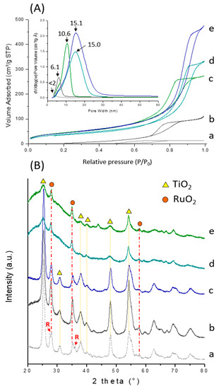To further investigate the impact of RuO2 particles on the textural and structural characteristics of supported catalysts, N2-adsorption and XRD analyses were carried out. From the N2-adsorption isotherms (Figure 4A), it can be seen that all TiO2-based materials retained their mesoporous structure after dispersion of the active elements. As a general trend, the specific surface area, pore volume and pore size decreased slightly after dispersion of RuO2 particles while the pore architecture was not altered, which could be beneficial for the diffusion of reactants and products during the catalytic process. For instance, the surface area, pore volume and pore diameter were determined to be 156 m2/g, 0.72 cm3/g and 15.1 nm respectively for the RuO2@TiO2-SiO2 3:3-ns catalyst (Table 2) and 193 m2/g, 1.17 cm3/g and 24.0 nm respectively for the corresponding TiO2-SiO2 3:3-ns support (Table 1). It is noteworthy to mention that all those catalysts had much better textural characteristics compared to other crystalline TiO2-supported Ru catalysts reported in the literature [26] due to the small-sized TiO2 particles resulting from the high hydrolysis ratio employed under our synthesis conditions (H2O/Ti = 88).