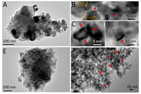 Representative TEM images of Ru@TiO2-sg (A–D) and Ru@TiO2-ns (E,F). Red arrows indicate the epitaxial growth of RuO2 crystallites over rutile-TiO2-sg (B–D) and formation of Ru clusters with an average diameter of 15–20 nm over TiO2-ns (F).