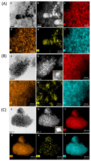 HAABF- (a) and HAADF-STEM (b) images together with corresponding energy dispersive X-ray (EDX) elemental mapping of Ti (c), Si (d), Ru (e), and O (f) for RuO2@TiO2-SiO2 3:1-ns (A), RuO2@TiO2-SiO2 3:2-ns (B), and RuO2@TiO2-SiO2 3:3-ns (C) catalysts. Insets in subfigures b show a higher magnification of RuO2 particles.
