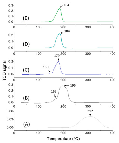 Temperature programmed reduction (TPR) patterns of RuO2@TiO2-sg (A), RuO2@TiO2-ns (B), RuO2@TiO2-SiO2 3:1-ns (C), RuO2@TiO2-SiO2 3:2-ns (D), and RuO2@TiO2-SiO2 3:3-ns (E).