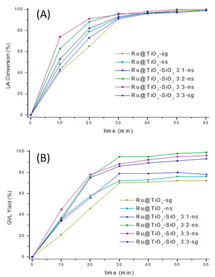 It is interesting to note that both LA conversion and GVL yield were influenced by the nature of the support material. For instance, the highest conversions were achieved with Ru particles supported on mixed TiO2-SiO2 oxides prepared by the template approach, intermediate activities were found for catalysts supported on nanostructured TiO2, and the lowest LA conversions were obtained with Ru dispersed over TiO2-sg and TiO2-SiO2-sg supports. A similar tendency was observed also in the GVL yield which increased with silica loading, reaching a maximum of 99% for the Ru@TiO2-SiO2 3:2-ns catalyst.