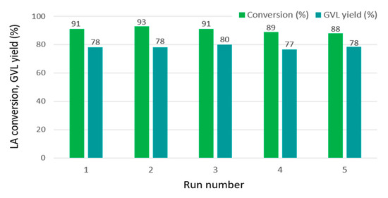 The catalytic performance of Ru-based catalysts can be further improved by depositing the metal particles on a solid support. In this regard, mesoporous materials have been widely used as versatile supports owing to their high surface areas and large pore volumes that provide numerous active sites on the catalyst surface [17,18,19,20]. In particular, Ru supported on activated carbon (Ru/C) was found to be highly effective for this reaction, achieving 100% LA conversion and 97.5% selectivity to GVL after 50 h at room temperature [21]. However, this catalyst also demonstrated rapid deactivation during the recycling process.