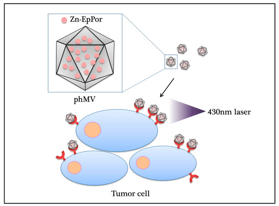 | PhMV | Zn-EpPor | reactive lysine-N-hydroxysuccinimide ester and cysteine-maleimide chemistries | prostate cancer, ovarian, and breast cancer cell lines | [96] |