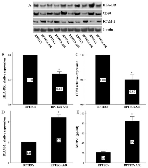 Indeed, RPTECs expressed all the above molecules. Anoxia-reoxygenation altered their levels significantly. It decreased HLA-DR by a factor of 0.62 ± 0.04 and CD80 by a factor of 0.50 ± 0.10 (Figure 1A,C). On the contrary, anoxia-reoxygenation increased ICAM-1 to 2.20 ± 0.12 times of the control (Figure 1A,D).