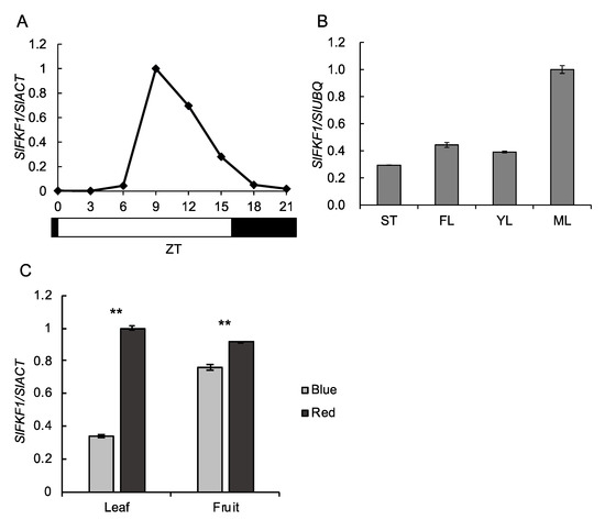 Shibuya, T.; Nishiyama, M.; Kato, K.; Kanayama, Y. Characterization of the FLAVIN-BINDING, KELCH REPEAT, F-BOX 1 Homolog SlFKF1 in Tomato as a Model for Plants with Fleshy Fruit. Int. J. Mol. Sci. 2021, 22, 1735. https://doi.org/10.3390/ijms22041735