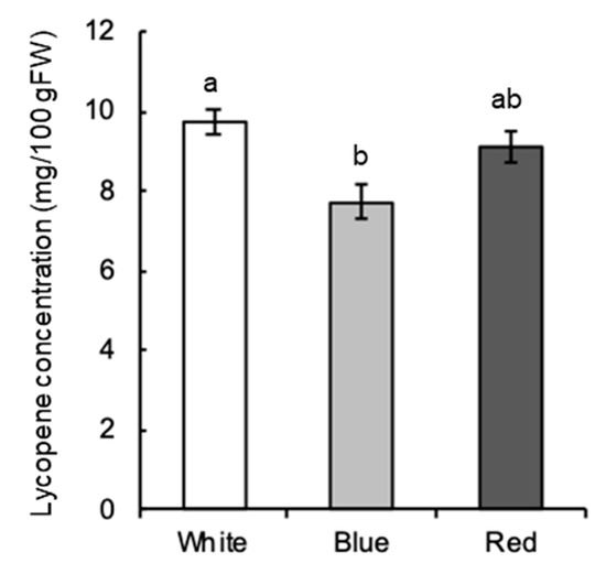 - Xie, B.-X.; Wei, J.-J.; Zhang, Y.-T.; Song, S.-W.; Su, W.; Sun, G.-W.; Hao, Y.-W.; Liu, H.-C. Supplemental blue and red light promote lycopene synthesis in tomato fruits. J. Integr. Agric. 2019, 18, 590–598. [Google Scholar] [CrossRef]