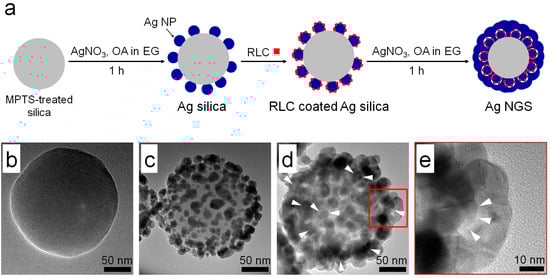 Synthesis and characterization of silver nanogap shell (Ag NGS) particles as near-infrared active surface-enhanced Raman scattering (SERS) nanoprobes. (a) Schematic illustration of the method used to prepare Ag NGS particles. Representative TEM images of (b) thiol-functionalized silica, (c) Ag silica, (d) Ag NGS, and (e) the interior gap structure of Ag NGS (white arrow heads) at high magnification.