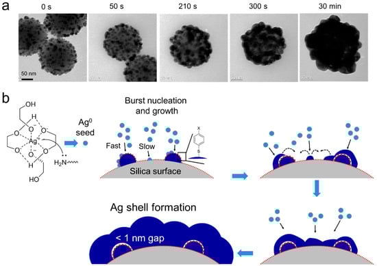 Observation and proposed mechanism of the shelling progress for Ag NGS structures. (a) TEM images of early-stage Ag NGS formation. Ag NPs coated on silica surfaces grew slowly at first, and additional seeding started after approximately 300 s. (b) Proposed mechanism of the Ag shelling progress starting from Ag silica. Ag+ ions in EG were easily reduced by octylamine using a chelating effect, and Ag0 rapidly induced the growth of Ag NPs on the silica surface. Ag0 approached the silica surface directly and slowly grew to form Ag NPs. Finally, the surface was fully covered with a robust Ag shell. Black line and dashed arrows indicate the nucleation and growth, respectively.