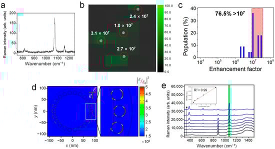The use of Ag NGS as a SERS probe was evaluated by single-particle SERS measurements, which were performed by point-by-point mapping on Ag NGS-dispersed glass slides. Then, SEM images were obtained and compared with the corresponding SERS-intensity maps to ensure that the SERS signals came from the individual Ag NGSs. A typical single SERS spectrum at an excitation wavelength of 785 nm is shown in Figure 3a, and the SERS intensity map for the 1075 cm−1 Raman band of the Ag NGS containing 4-FBT in the gap was overlaid with the corresponding SEM image (Figure 3b). The SERS enhancement factor (EF) for the Ag NGS can be calculated using the well-known equation, EF = (ISERS/NSERS)/(Inormal/Nnormal), where ISERS and Inormal are the intensities of a Raman band from SERS and normal Raman scattering, respectively, and Nnormal and NSERS are the numbers of 4-FBT in pure form and in self-assembled form on the Ag NGS surface, respectively. The Raman band at 1075 cm−1 for 4-FBT was used to estimate the EF. Ag NGS NPs dispersed on a patterned slide glass and neat 4-FBT (liquid) were used to measure ISERS and Inormal, respectively, using an identical laser power of ×100 objective lens (NA 0.90) for the EF calculation. To obtain Nnormal, a light collection volume of 18.8 μm3 was approximated from a cylindrical illuminated volume with a 2-μm diameter and a 6-μm height for normal Raman measurements. Using this approach, the SERS EF of 22 Ag NGS particles was calculated as 1.7 × 107 on average. This value is quite high compared to representative EFs (1.5 × 105–2.8 × 105) of aromatic small molecules on Au nanorods that are commonly used as NIR SERS probes []. Remarkably, the EF values showed a narrow distribution, ranging from 1.1 × 107 to 3.9 × 107 for 76.5% of the measured population. All the analyzed particles displayed EFs of 2.1 × 106 or more (Figure 3c), suggesting that Ag NGS enhanced the Raman signal with high sensitivity and uniformity. These findings suggest that Ag NGS contained an interior nanogap structure that was precisely controlled by a monolayer of aromatic thiol molecules. To support this result, we calculated the electric field (E-field) enhancements of the Ag NGS using the finite-element method (FEM) at λ = 785 nm (Figure 3d). The dimensions of the Ag NGS (Figure S7) were defined based on the TEM analysis shown in Figure 1. The calculation revealed that the E-field enhancement was highly maximized at the interior nanogaps (~1 nm) between the inner Ag NPs and the outer shell. Data from previous investigations performed to demonstrate gap-enhancement effects have suggested that electron transport (i.e., chemical enhancement) occurs for these three-dimensional intra-particle nanogaps, ranging in size from 0.7 to 2 nm, and that a non-quenching system could be achieved by controlling the tunneling effect between the nanogaps [,,]. This FEM simulation was consistent with previous reports and successfully demonstrated why interior nanogap generation is critical for developing ultrasensitive SERS nanoprobes and why Ag NGS can generate strong SERS signals even from a single particle.