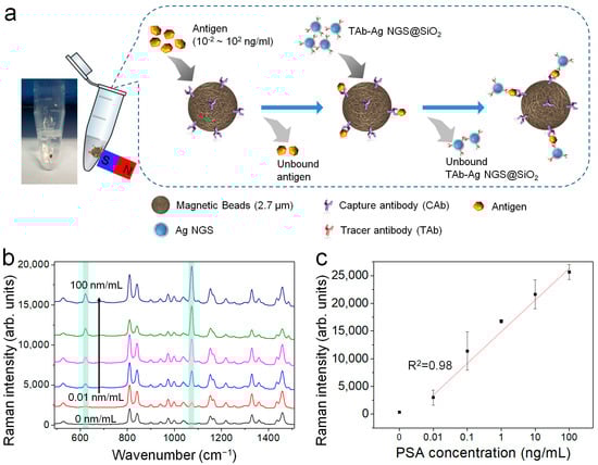 Quantitative detection of a prostate cancer biomarker (PSA) based on SERS spectroscopy, using a sandwich immunoassay method. (a) Schematic illustration of PSA detection using Ag NGS particles and magnetic beads (MBs). (b) SERS spectra of Ag NGS[4-FBT]@SiO2 particles conjugate to MBs, used to detect PSA at different concentrations (0 to 100 ng/mL). (c) Corresponding SERS intensities at 1075 cm−1 in (b) as a function of the logarithm of the PSA concentration.