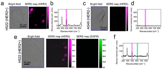 To expand the application of extracellular imaging and multiplex analysis, cell-based assays were performed using HER2-overexpressing H522 NSCLC cells and EGFR-overexpressing A549 cells (adenocarcinoma human alveolar basal epithelial cells) [,]. Previous data suggested that multiplex analysis of EGFR and HER2 expression could help in determining the prognosis of patients with NSCLC after gefitinib treatment [,,]. Using the characteristic SERS signals of RLCs as a signature of specific biomarker proteins, SERS mapping for the expressed cancer biomarkers was performed using a confocal Raman microscope. To construct SERS maps, the SERS intensities at 623 cm−1 and 494 cm−1 (which correspond to 4-FBT and 2-FBT, respectively, and do not overlap) were used to distinguish both biomarkers. Figure 5 shows bright-field microscope images and SERS-mapping images (Figure 5a and Figure 5c, respectively), and the corresponding SERS spectra observed (Figure 5b and Figure 5d, respectively) in each cell treated with HER2-Ag NGSs[2-FBT]. As expected, HER2-positive H522 cells showed a clear 2-FBT signal (purple signal) after successful targeting with HER2-Ag NGSs[2-FBT]. The 2-FBT signal was not found with the HER2-negative A549 cell lines (used as a negative control). Figure S11a,c show the bright-field images and SERS maps of 4-FBT of EGFR-Ag NGS[4-FBT]-treated EGFR-positive A549 and EGFR-negative H522 cells (green signal). No 4-FBT signal was observed with H522 cells (Figure S11b), and only A549 cells showed a SERS signal at 623 cm−1 for 4-FBT (Figure S11d), revealing the specific targeting ability of EGFR-Ag NGS[4-FBT]. These results suggest that antibody-conjugated Ag NGS probes can selectively target biomarkers on cell surfaces. Consequently, H522 cells were treated with EGFR-Ag NGSs[4-FBT] and HER2-Ag NGSs[2-FBT] simultaneously. Only HER2-Ag NGSs[2-FBT] targeted H522 cells, and Raman signals of 2-FBT were observed exclusively (Figure 5e,f). These results indicate that Ag NGSs could be used to validate biomarker expression and potentially as multiplex-capable SERS tags in bio-images with a strong signal.
