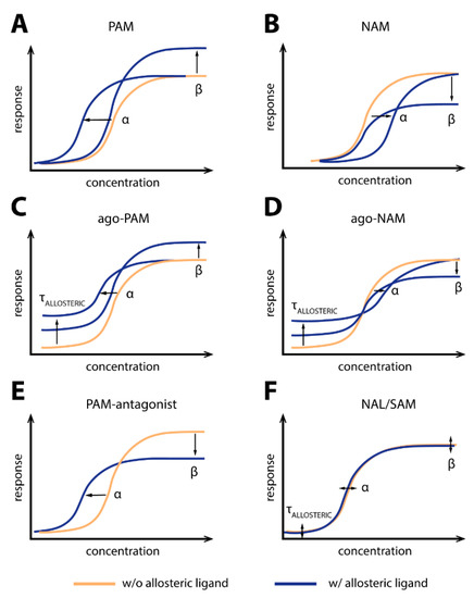 Overview of different modes of allosteric modulation. Agonist dose–response curves in absence of an allosteric ligand are shown in orange, while presence of an allosteric ligand is depicted in blue. (A) A positive allosteric modulator (PAM) increases affinity and/or efficacy of an orthosteric ligand, and thus has positive co-operativity factors α and/or β. (B) A negative allosteric modulator (NAM) reduces affinity and/or efficacy of an orthosteric ligand and has a negative α- and/or β-factor. (C) An ago-PAM has intrinsic efficacy (τ > 0) and is also a PAM for an orthosteric ligand. (D) An ago-NAM is a negative allosteric modulator for an orthosteric ligand that increases the activity state of the receptor (τ > 0) itself. (E) A PAM-antagonist decreases efficacy of an orthosteric agonist and thus functions as an antagonist (β < 0) and simultaneously increases affinity of the orthosteric ligand (α > 0). (F) A negative allosteric ligand (NAL) or silent allosteric modulator (SAM) has no effect on the affinity or efficacy of an orthosteric ligand (α,β = 0) but occupies the allosteric binding site, and thus competes with other allosteric ligands for this site.