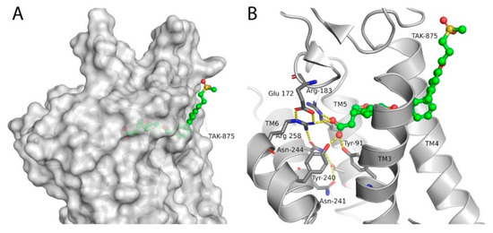 (A) The partial agonist TAK-875 seems to enter its allosteric binding pocket (site A) in an unusual way, most likely through the lipid layer, sneaking into the receptor transmembrane region. (B) Detailed view on binding pose of TAK-875 with the head group buried in the receptor transmembrane region. Hydrogen bonding pattern of TAK-875 with key residues in its allosteric binding pocket shown as dashed lines. This figure was prepared using The PyMOL Molecular Graphics System, Version 2.0 Schrödinger, LLC (New York, NY, USA).