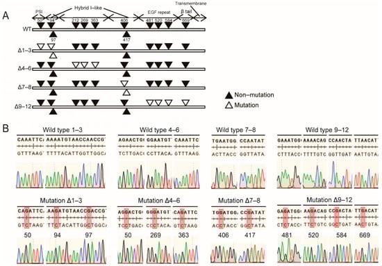 Previous study had illustrated that 12 N-glycosylation sites characterized by asparagine residues within the NX(S/T) consensus sequence exist on integrin β1. Among them, the N564 and N74 sites do not normally carry N-glycan []. The other 10 N-glycosylation sites were respectively located in the plexin-semaphorin-integrin (PSI) domain, integrin-epidermal growth factor domain (I-EGF), I-like domain, and β-tail domain (Figure 1A). To investigate the effect of losing N-glycan modification at given sites on the expression and biological function of integrin β1, we converted 10 asparagine residues within the above four domains into aspartic acid through site-specific mutagenesis. The primers used for amplification and mutation of integrin β1 are shown in Table 1. The constructed mutants are listed below: the Δ1–3 β1 mutant in PSI and upstream of the hybrid domain, Δ4–6 in the I-like domain, Δ7–8 downstream of the hybrid domain, and Δ9–12 in the I-EGF domain (Figure 1A). The mutant base sequence is listed in Figure 1B.