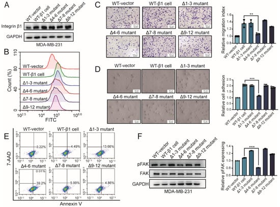 Effects of β1 mutants on behavior of MDA-MB-231 cells. (A) Expression of integrin β1 in constructed mutant cells by Western blotting. (B) Surface expression of integrin β1 in constructed mutant cells by flow cytometry. (C) Cell adhesion on fibronectin (FN) in wild-type (WT) and mutant cells. ** p < 0.01. (D) Migration of WT and mutant cells by transwell assay. *** p < 0.001. (E) Apoptosis of WT and mutant cells by flow cytometry (F) Focal adhesion kinase (FAK) activation of WT and mutant cells. *** p < 0.001. Full-length blots/gels for Figure 2A,F are shown as Figure S1.
