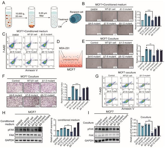 Effects of secreted components from β1 mutants on behavior of recipient cells. (A) Workflow of conditioned medium (CM) preparation and treatment. (B) Adhesion ability on FN of MCF7 cells treated with CM from mutant cells. *** p < 0.001. (C) Apoptosis of MCF7 cells treated with CM from β1 mutants by flow cytometry. (D) Workflow of the co-culture system. (E) Adhesion of MCF7 cells on FN co-cultured with β1 mutants. ** p < 0.01. (F) Migratory ability of MCF7 cells co-cultured with β1 mutants by transwell assay. *** p < 0.001. (G) Apoptosis of MCF7 cells co-cultured with β1 mutants by flow cytometry. (H,I) FAK activation of MCF7 cells treated with CM (H) or co-cultured (I) with β1 mutants by Western blotting. Results are presented as mean ± SD from three independent experiments. ** p < 0.01, *** p < 0.001. Full-length blots/gels for Figure 3H,I are shown as Figure S2.