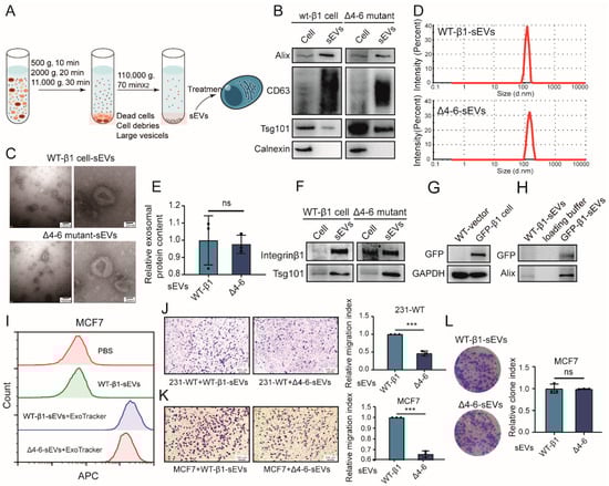 Notably, the presence of integrin β1 in sEVs (termed vesicular β1) from WT-β1 cells and the Δ4–6 mutant (termed WT-β1-sEVs and Δ4–6-sEVs) was clearly revealed by Western blot (Figure 4F). To further verify the presence of the integrin β1 mutant on sEVs, green fluorescent protein (GFP)-tagged integrin β1 was introduced into MDA-MB-231 cells (termed GFP-β1 cells) [] (Figure 4G). Western blotting showed that GFP was detected on sEVs (Figure 4H), indicating that WT and Δ4–6 mutant β1 could also be packed into sEVs. Flow cytometry analysis revealed that ExoTracker-labeled WT-β1-sEVs and Δ4–6-sEVs were both efficiently taken up by MCF7 cells (Figure 4I), indicating that transfer of vesicular β1 was not affected by N-glycosylation site mutants. To explore the functional role of N-glycosylation differences in vesicular β1, a transwell assay was performed. We found that the migratory ability of both recipient MDA-MB-231 and MCF7 cells was significantly suppressed by Δ4–6-sEVs (Figure 4J,K). Proliferation changes were checked using a colony formation assay, and the colony formation of MCF7 was not altered by Δ4–6-sEVs (Figure 4L).