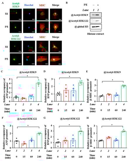 ChIP assay was performed as described previously, with the following modifications [66]. In brief, primary cardiomyocytes prepared from neonatal rats were treated with or without 30 μM PE for 15, 60, or 240 min. After fixation of the genomic DNA and nuclear proteins with formalin, the cellular extract was sonicated with a Bioruptor UCD-250 sonicator (Cosmo Bio, Tokyo, Japan); the DNA-protein complex was immunoprecipitated with anti-acetyl-histone-H3 (K9) antibody, anti-acetyl-histone-H3 (K122) antibody, or rabbit IgG; and the immunocomplexes were collected by incubation with antirabbit IgG-conjugated Dynabeads (Invitrogen).
