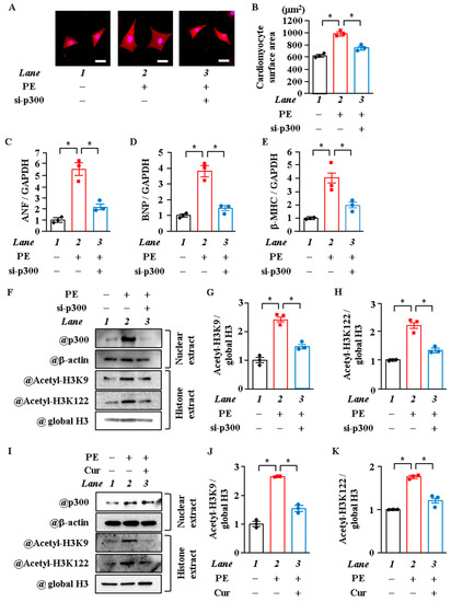 Although H3K122 has been reported to be acetylated by p300, a histone acetyltransferase, in vitro [26], various types of HAT are present in cells, and the type of HAT differs depending on the cell type and the histone acetylation site [31,32,33]. Previous studies have found that p300 is required for acetylation and for the transcriptional activity of GATA4, as well as for pathological left ventricular hypertrophy and the development of HF in vivo [9,34,35]. To investigate whether p300 acetylates H3K9 and H3K122 in cardiomyocyte hypertrophy, cardiomyocytes were treated with p300 small interfering RNA (siRNA) or with curcumin, a p300 specific HAT inhibitor, and then stimulated with PE. Results of immunostaining and surface area measurement showed that p300 knockdown and curcumin suppressed PE-induced cardiomyocyte hypertrophy (Figure 2A,B and Figure S1A,B). PE-induced increase in the mRNA levels of ANF, BNP, and β-MHC was suppressed by p300 knockdown and curcumin (Figure 2C,E and Figure S1C,E). Moreover, both p300 knockdown and curcumin suppressed the acetylation levels of H3K9 and H3K122 by PE (Figure 2F–K). These results indicate that the HAT activity of p300 acetylates H3K9 and H3K122 in hypertrophic response.