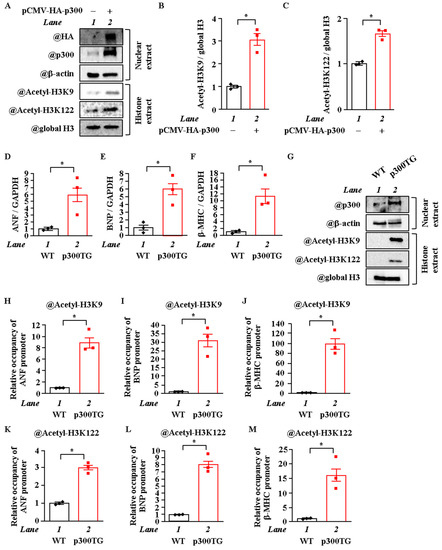 To investigate whether p300 overexpression increases the acetylation levels of H3K9 and H3K122, cardiomyocytes were transfected with pCMV-p300 CHA or pcDNA null vector. The results showed that p300 overexpression induced an increase in the acetylation levels of both H3K9 and H3K122 (Figure 3A–C). To investigate whether p300 overexpression also increases the acetylation levels of H3K9 and H3K122 in vivo, transgenic mice that exhibited cardiac-specific p300 overexpression (α-MHC-p300-TG mice) were used. This p300 overexpression has been shown to induce left ventricular remodeling and HF [7]. The heart weight/body weight ratio was significantly increased in the p300-TG mice compared to the wild-type (WT) mice at 26 weeks of age (Figure S2A,B). As shown in Figure 3D–F, mRNA (ANF, BNP, and β-MHC) levels were significantly increased in the p300-TG mice compared to the WT mice. Moreover, WB analysis showed that the acetylation levels of H3K9 and H3K122 were also significantly increased in the p300-TG mice compared to the WT mice (Figure 3G). Next, an in vivo ChIP assay revealed that H3K9 and H3K122 were highly acetylated on the ANF, BNP, and β-MHC promoters in vivo (Figure 3H–M). These results indicate that p300 acetylates H3K9 and H3K122 in the heart in vivo.