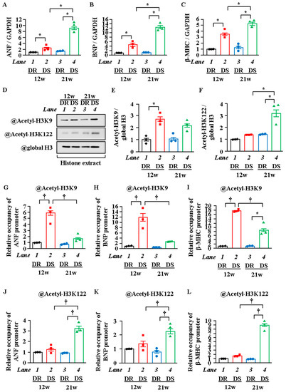 H3K9 acetylation was increased at the LVH stage, but H3K122 acetylation was increased at the HF stage. At 6 weeks of age, male Dahl salt-sensitive (DS) and salt-resistant (DR) rats were given an 8% NaCl diet for the following 6 or 15 weeks. Using echocardiography, left ventricular hypertrophy (LVH) stage was confirmed at 12 weeks of age, and heart failure (HF) stage was confirmed at 21 weeks of age. (A–C) mRNA was extracted from the hearts of DR and DS rats at 12 or 21 weeks of age, and mRNA levels of ANF (A), BNP (B), and β-MHC (C) were measured. (D–F) Nuclear proteins and histone fraction were extracted from the hearts of DR and DS rats at 12 or 21 weeks of age. (D) is a photograph of a representative Western blot, and (E,F) are quantifications (D). (G–L) In vivo ChIP assay was performed using heart lysates of DR and DS rats at 12 or 21 weeks of age with anti-acetyl-histone H3K9 antibody (G–I), anti-acetyl-histone H3K122 antibody (J–L), or normal rabbit IgG as a negative control (not detected). (A–C and E–L), N = 3; two-way ANOVA followed by Tukey test. * p < 0.05, † p < 0.01.
