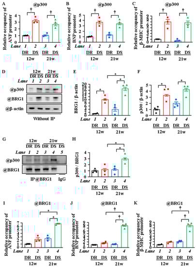 The above experiments demonstrated that the increase in transcription that occurs with the transition from the LVH stage to the HF stage is associated with differences in the site of histone acetylation during each stage. To investigate whether the change in recruitment of p300 onto the reactive gene promoters affects this change in the histone acetylation domain, an in vivo ChIP assay was performed. The results showed that the amount of p300 recruited onto the ANF, BNP, and β-MHC promoters was much higher in the 12w and 21w DS rats compared with the 12w and 21w DR rats, respectively. However, the amount of p300 recruited was similar in the 12w DS and 21w DS rats (Figure 5A–C). This suggests that the change of histone acetylation sites between LVH and HF is not depended on the alternation of p300 recruitment to the promoter. Thus, we hypothesized that this change is regulated by other factors, such as chromatin remodeling factors. One factor that may be involved is BRG1. BRG1 is a catalytic subunit of the SWI/SNF chromatin remodeling complex, and it has been shown to cooperate with p300 in histone acetylation (H3K27) during transcriptional upregulation [36]. It is possible that BRG1 is associated with the change in sites of histone acetylation. Therefore, to investigate whether the amount of binding between BRG1 and p300 changes in the HF stage, an IP-WB assay was carried out at the HF and LVH stages. The results showed that the amount of this binding was increased in the 21w DS rats compared with the 21w DR rats but was not increased in the 12w DS rats (Figure 5D–H). To investigate whether BRG1 is associated with the change in the acetylation site from the tail domain to the globular domain during the transition from the LVH stage to the HF stage, an in vivo ChIP assay was performed. The results showed that the recruitment of BRG1 to the ANF, BNP, and β-MHC promoters was increased in the 21w DS rats compared with in the 21w DR rats, but not in the 12w DS rats (Figure 5I,J).