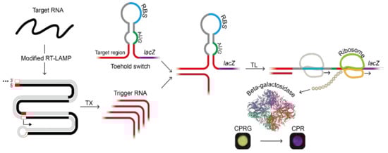 RNA toehold switch sensors are robust molecular switches that can be used to detect RNA molecules in a sequence-specific manner. This flexible switch had been combined with a paper-based cell-free molecular diagnostic platform to detect various target nucleic acids [12,13,14]. However, to enable the sensitive detection of nucleic acids, toehold reactions require an amplification step that multiplies target RNA. The isothermal nucleic acid amplification method has been often applied to this molecular diagnosis to enhance the detection limit. The previously adapted method was NASBA, which takes 1–3 h for the amplification and requires multiple preparation steps to acquire reaction mixtures. As an alternative, we introduced RT-LAMP as an isothermal amplification method for the toehold reaction. RT-LAMP recently emerged as a promising molecular diagnosis method due to its short reaction time and high amplification potential. However, to trigger the toehold reaction, the RT-LAMP amplicon’s output product must be transcribed into RNA. To address the challenge, we strategically modified RT-LAMP primers to include the T7 promoter sequence in the RT-LAMP amplicon and found that the transcript of the RT-LAMP amplicon was successfully untwisted the toehold switch sensor, enabling the LacZ-mediated colorimetric detection.