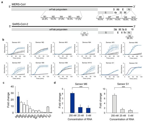 Next, we evaluated the sensitivity of sensors, M6 and S1. After testing a series of target RNA concentrations, we found that the toehold reaction was initiated with as little as 250 nM of target RNA for both sensor M6 and S1 (Figure 2d). However, it was insufficient to detect the viral RNA, considering that the average viral load of MERS-CoV and SARS-CoV-2; 1.9 ×