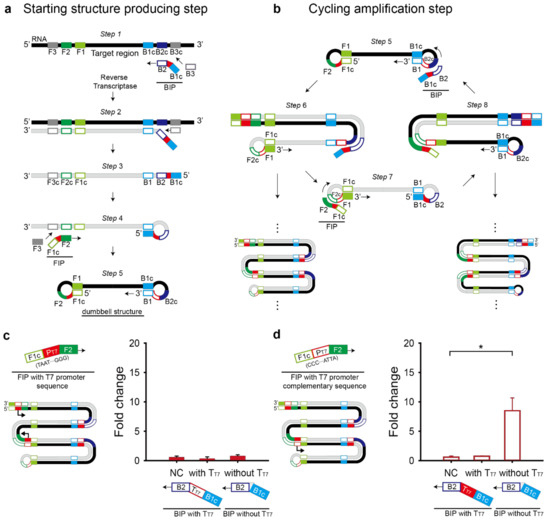 The RT-LAMP reaction consists of a starting-structure-producing step and a cycling amplification step (Figure 3a,b). The starting structure is a dumbbell-like structure (Step 5 in Figure 3a), from which the cycling amplification can proceed. In the cycling amplification step, both starting and intermediate structures contain the self-primed DNA region, which elongates from 5′ to 3′ direction by a strand-displacing polymerase, called Bst DNA polymerase and the loop region, which recruits additional hybridization primers. The two features contribute to the target region amplification [21,22].