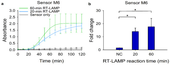 For sensor M6, when the Loop primer B was used, the detection limit was dramatically enhanced compared to the assay with no loop primers, reaching 1200 copies per reaction (120 copies/μL, 200 aM) (Figure 4b). When both Loop B and F primers were used, the reaction detected as few as 120 copies per reaction (12 copies/μL, 20 aM), which would be sufficient sensitivity to detect MERS-CoV virus in clinical samples [19].